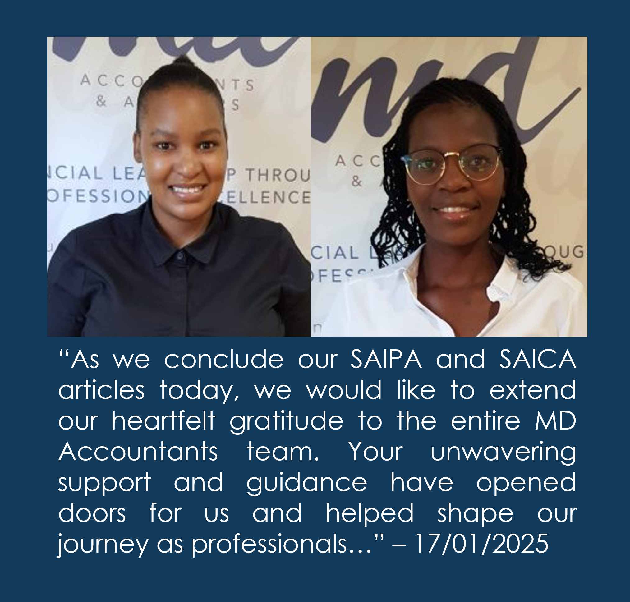 As we conclude our SAIPA and SAICA articles today, we would like to extend our heartfelt gratitude to the entire MD Accountants team. Your unwavering support and guidance have opened doors for us and helped shape our journey as professionals.