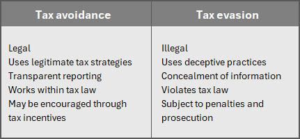 The line between tax avoidance and tax evasion can sometimes appear blurry, especially in complex transactions or fierce tax planning strategies. The comparison below is a good starting point:
